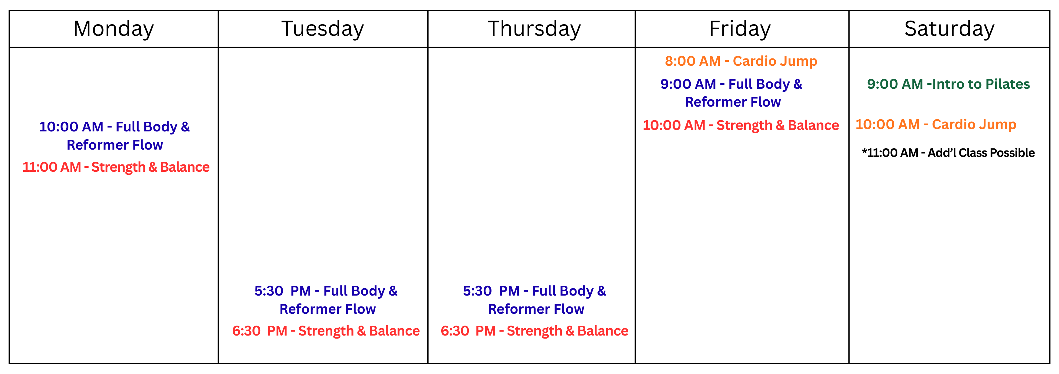 1. Intro to Pilates: Beginner-friendly class focused on alignment, breath, and Pilates fundamentals.All private classes are appointment only. Appointments may be set by contacting the Pilates instructor. All new clients must go through an Initial Assessment/Screening prior to starting any private or semiprivate sessions. Classes are available in the morning or late afternoon on various days of the week, including Saturdays by appointment.